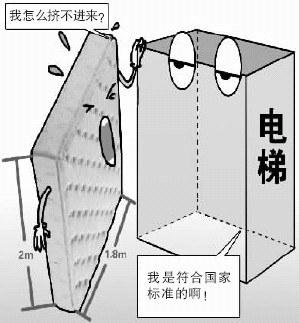 记者调查发现,市场上销售的大型家具数量增加,但部分房地产的电梯空间相对较小。尹先生遇到的矛盾并不孤单,电梯配置与居民需求之间的矛盾日益突出。