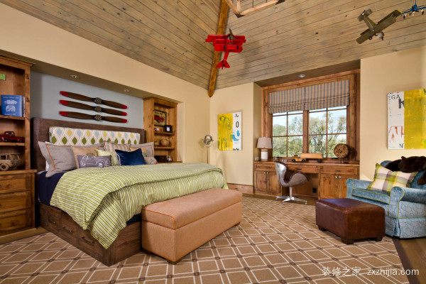 2:在家具的选择上,考虑到是男孩房间的设计,我们应该选择一些强硬的线条,以满足男孩的个性特征装饰,因为男孩更活跃,所以在选择床时,我们可以选择高低床到孩子爬上爬下的能力。